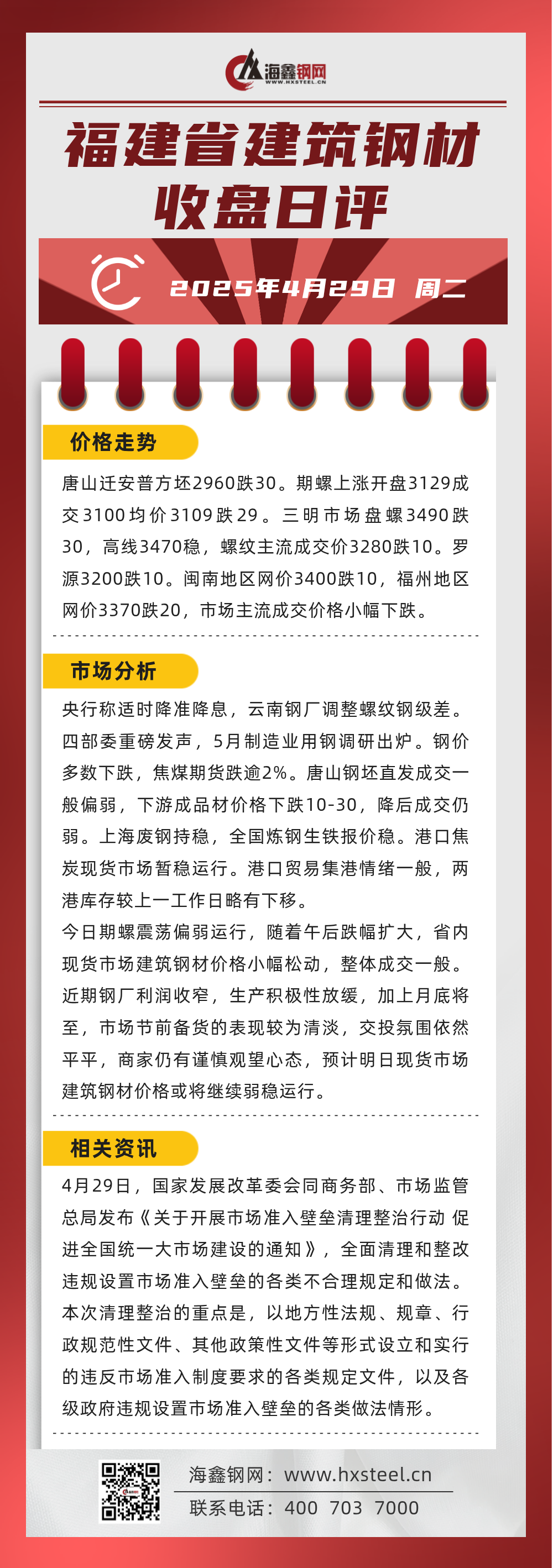 4月29日福建省內(nèi)建筑鋼材收盤日評(píng)