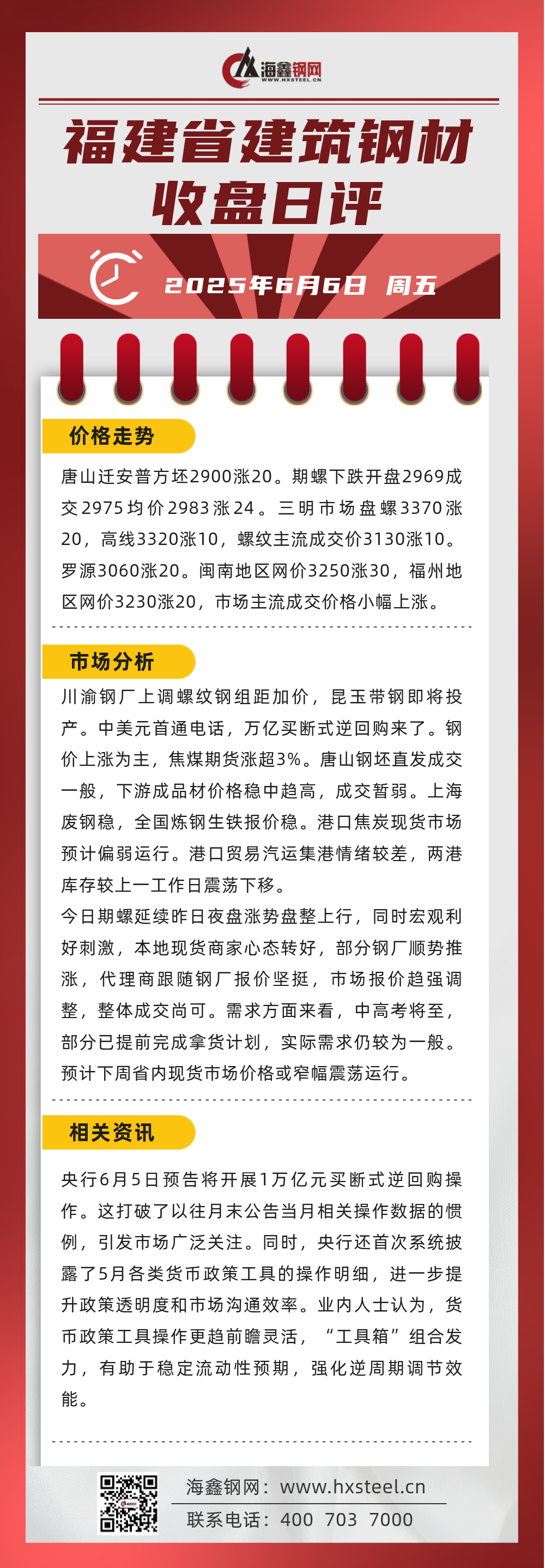 6月6日福建省內(nèi)建筑鋼材收盤日評(píng)