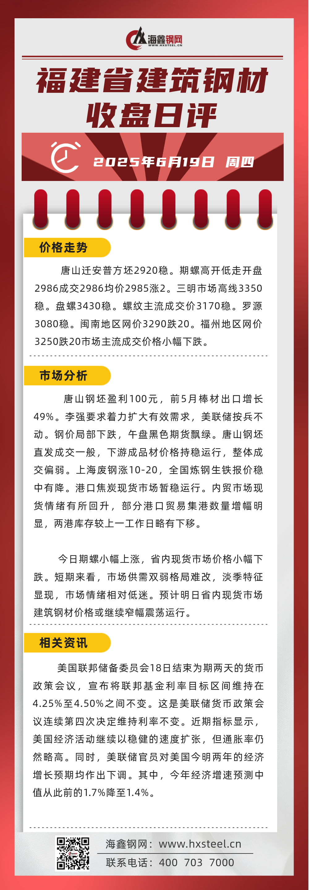 6月19日福建省內(nèi)建筑鋼材收盤日評