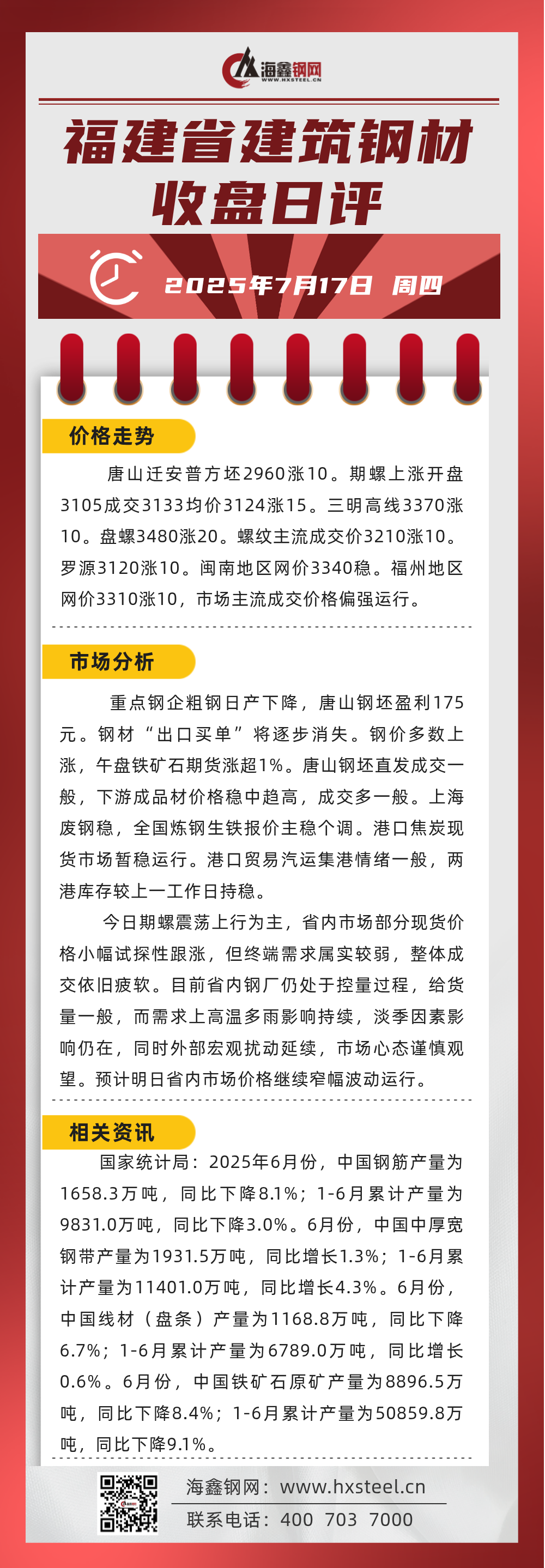 7月17日福建省內建筑鋼材收盤日評